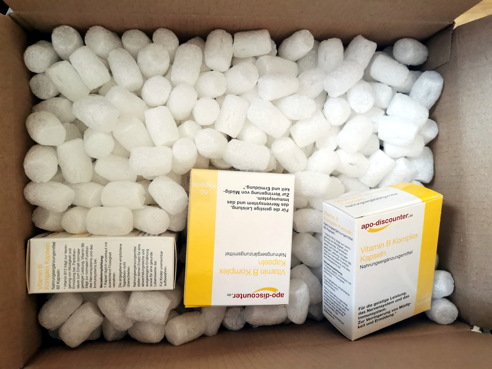 Um den neuen Service zu testen, bestellen wir Produkte im Wert von 16 Euro. Es handelt sich um drei Packungen Vitamin B12 Komplex als Eigenmarke von Apo-Discounter. Versandkosten gibt es nicht, weil der Auftragswert bei mehr als 15 Euro liegt.