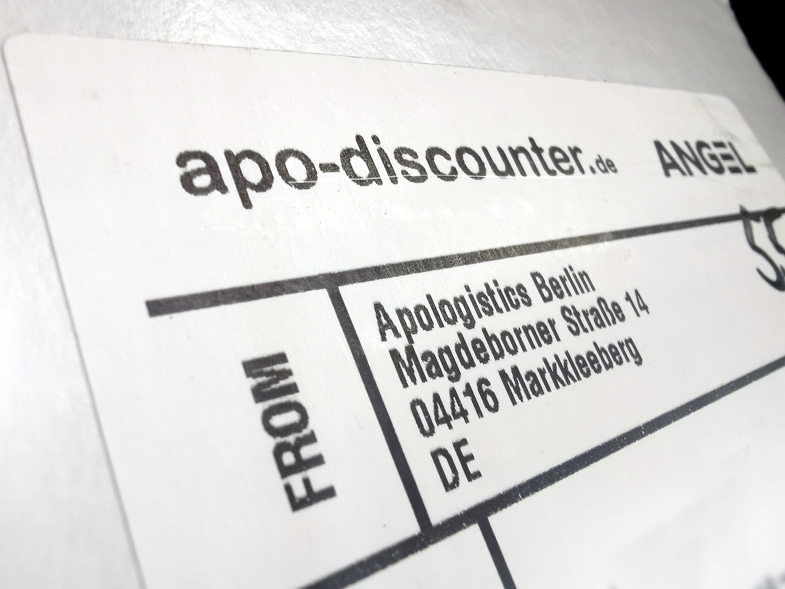 Wir schauen uns in Ruhe die Sendung an. Absender ist „Apologistics Berlin“ mit Sitz in Markkleeberg, das ist die Firma, die auf der Logistikseite hinter Apo-Discounter steht. Auf der Rechnung taucht dann die Apotheke im Praunsdorf Center auf, allerdings ebenfalls mit Adresse in Markkleeberg. Auf einem Etikett taucht noch der Hinweis „DHL Sameday (1/0)“ auf – vermutlich hat der Logistikkonzern die Sendung abgeholt und nach Berlin gebracht, wo sie dann an den Spediteur übergeben wurde.