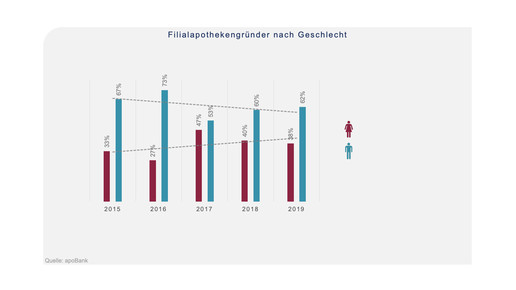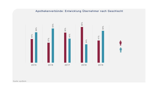 Trotz Schwankungen und tendenzieller Annäherung werden Filialapotheken vor allem von Männern - ob neu oder durch Übernahme bestehender Apotheken – gegründet. Im Jahr 2019 wurden 62 Prozent der Filialapotheken von Männern gegründet. Gut ein Drittel der Filialgründungen entfielen demnach auf Frauen. Mit 47 Prozent Anteil erreichten die Frauen beim Filialgründungen 2017 einen Spitzenwert. Hier spielt sicherlich auch die höhere Zahl an bereits niedergelassenen Apothekern eine Rolle: Denn obwohl seit Jahren der Anteil der Frauen unter den Existenzgründern höher ist, liegt der Männeranteil bei den niedergelassenen Apothekern noch bei rund 51 Prozent. Ein Rückblick auf die letzten Jahre gibt keine eindeutige Antwort auf die Frage, welches Geschlecht nun Verbundkäufe präferiert. Hier schwanken die jährlichen Anteile stark.