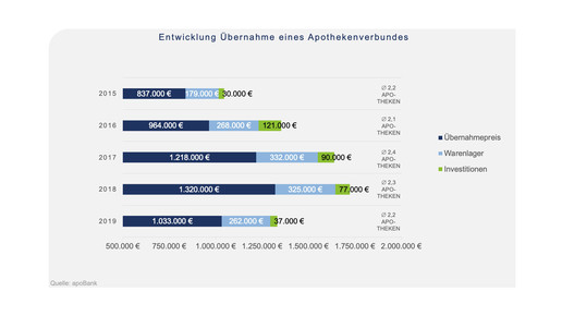 Danach ist mit 21 Prozent die Übernahme von ganzen Apothekenverbünden nach wie vor eine beliebte Option. Bis 2018 ist eine deutliche Zunahme bei den Kaufpreisen und Gesamtinvestitionen für Verbundübernahmen von mindestens zwei Apotheken desselben Abgebers zu sehen. Von gut einer Million Euro im Jahr 2015 stiegen laut Apobank die Gesamtinvestitionen auf über 1,7 Millionen Euro im Jahr 2018. Ähnlich wie bei der klassischen Übernahme einer Apotheke zeigt die Analyse für 2019 auch hier rückläufige Investitionssummen. So zahlten die Übernehmer im Schnitt für einen Apothekenverbund 1,03 Millionen Euro und damit deutlich weniger als in den beiden Jahren davor. Zuzüglich der zu übernehmenden Warenlager und weiteren Investitionen in Umbaumaßnahmen, Geschäftsausstattung oder IT betrug das Gesamtvolumen 2019 hier durchschnittlich 1,33 Millionen Euro.