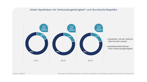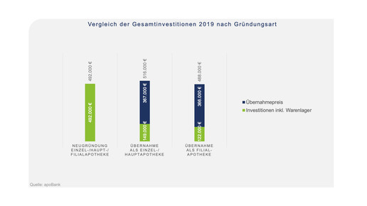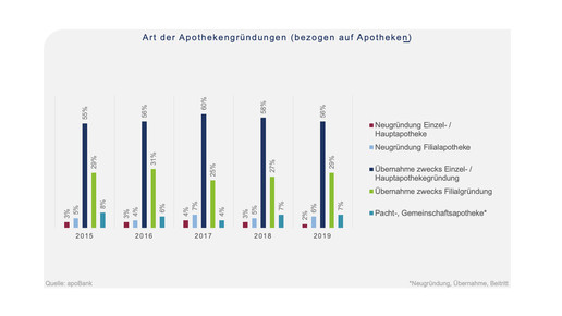 29 Prozent der Apotheken wurden 2019 zwecks Filialbildung übernommen. Neugründungen von Einzel-/Hauptapotheken spielen 2019 mit 2 Prozent kaum eine Rolle, etwas häufiger kommen sie bei Filialen vor (6 Prozent). Anders als bei Einzel- oder Hauptapotheken und Apothekenverbünden sind bei den Übernahmen zwecks Filialbildung die durchschnittlichen Kaufpreise etwas gestiegen und lagen 2019 bei 488.000 Euro, im Jahr davor betrugen sie noch 458.000 Euro. Das deutet laut Apobank darauf hin, dass nun häufiger etwas umsatzstärkere Apotheken zu höheren Kaufpreisen als Filialen übernommen worden sind.