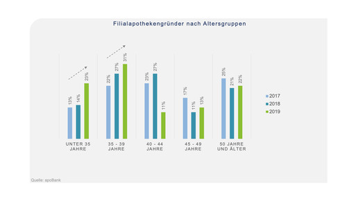 Gesunken ist das Durchschnittsalter der Filialgründer in den letzten Jahren. Offenbar wird es zunehmend auch für jüngere Apotheker interessant, Filialen zu gründen und auf diese Art zu expandieren, denn der Anteil der Filialgründer unter 40 Jahren ist in den letzten Jahren deutlich gestiegen: von 35 Prozent im Jahr 2017 auf 54 Prozent im Jahr 2019. Allerdings bleibt die Geschäftserweiterung durch Filialbildung nach wie vor auch für erfahrene Apotheker eine Option. Entsprechend war gut jeder fünfte Filialgründer 50 Jahre und älter. Zum Vergleich: Das Durchschnittsalter derer, die sich erstmalig mit einer Einzelapotheke oder einem Verbund niedergelassen haben, lag unverändert bei 38,4 Jahren.