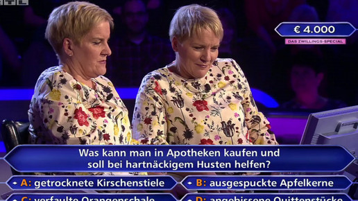 Bei „Wer wird Millionär“ gab es übrigens neulich wirklich eine Apothekenfrage: „Was kann man in Apotheken kaufen und soll bei hartnäckigem Husten helfen?“ Antwortmöglichkeit A: getrocknete Kirschenstiele. Möglichkeit B: ausgespuckte Apfelkerne. C: verfaulte Orangenschale. D: angebissene Quittenstücke. Na los, das wissen Sie!