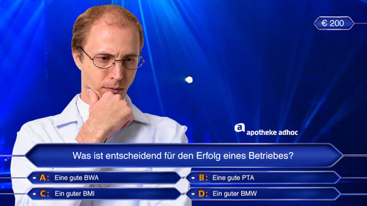 Klug sagt B! Und das ist nicht so klug. Sicher? Ja klar! Dann logge ich jetzt B ein, ohne Joker? Ja, B, ohne meine PTA könnte ich den Laden heute zusperren! Tja, das ist leider falsch, stöhnt der Moderator mit seinem besten Ausdruck bedauernder Anteilnahme. Musik an, Apotheker nach rechts ab und der nächste Kandidat.