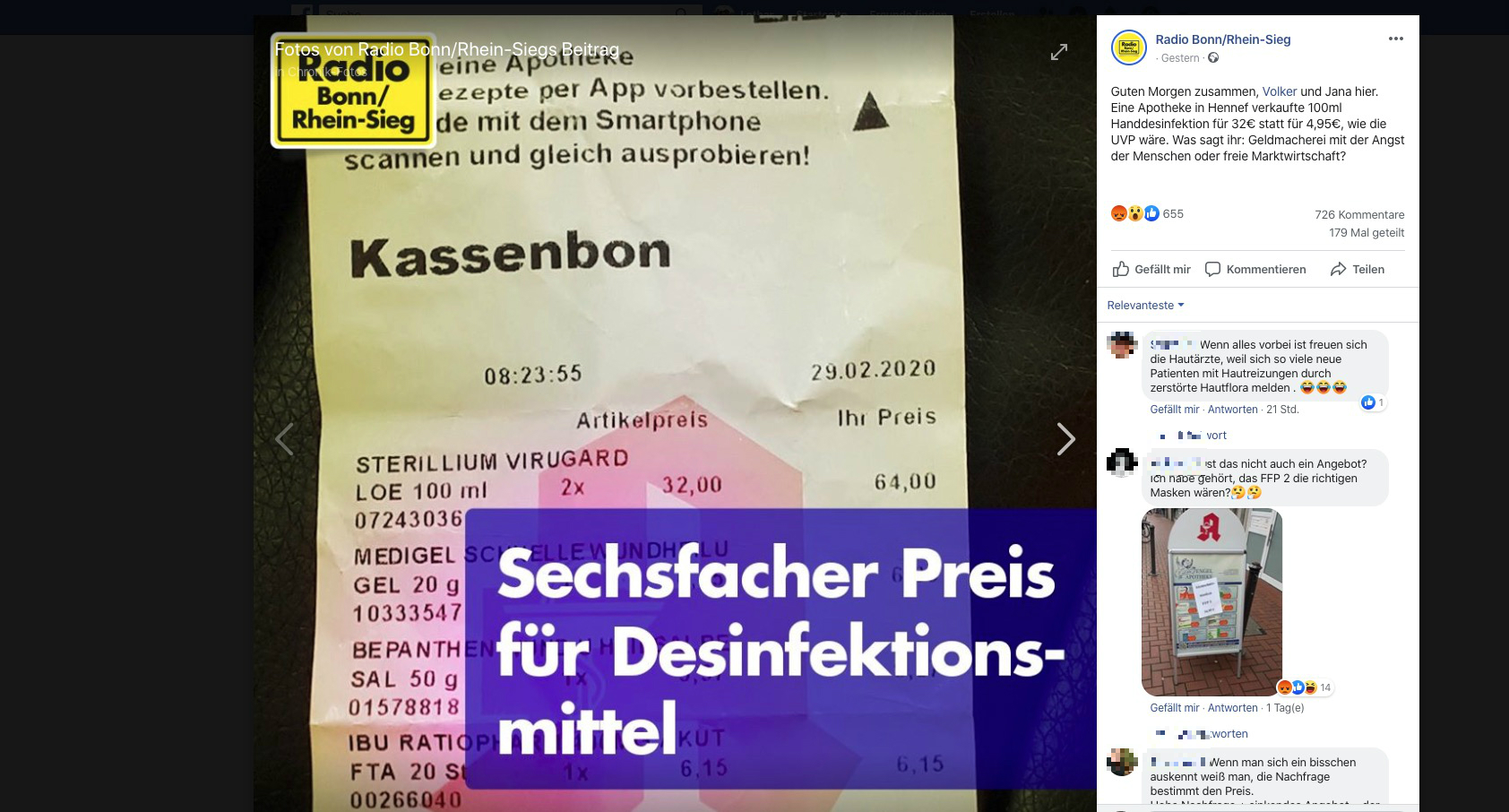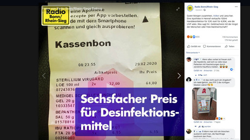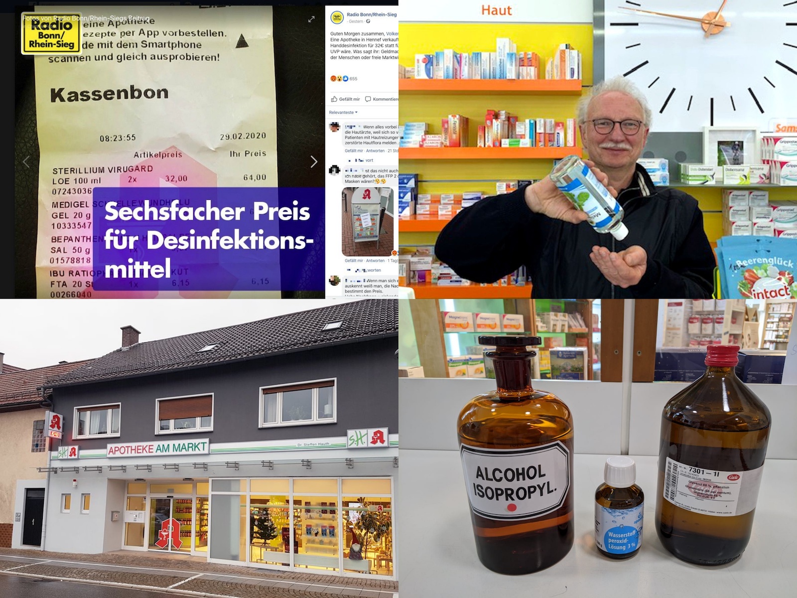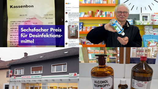 Wucher bei den derzeit viel gefragten Produkte ist vor allem bei „Playern“ (sic!) wie Amazon und Ebay zu beobachten, ein moderater Preisanstieg bei Versandapotheken. Vor Ort kann man sich solche Geschäftemacherei kaum erlauben, die Kunden vergessen so etwas nicht. Wo sie im Einzelfall auftauchen, sind die Reaktionen entsprechend. Wäre zu wünschen, dass sich die Leute merken, auf wen sie sich verlassen können. Keine günstige, aber immerhin eine Alternative: Notfalls kann man auch mit 4711 oder Melissengeist desinfizieren.