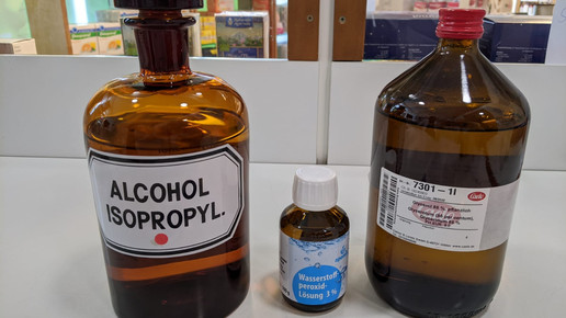 Dann endlich: Bundesgesundheitsminister Jens Spahn (CDU) kündigte festlich an und die Bundesstelle für Chemikalien verkündete, dass Apotheker jetzt auch Apotheker sein dürfen. Steriles Wasser Marsch! Der Apotheker wollte gleich mit der Produktion starten. Allerdings hatten weniger zurückhaltende Kollegen die Großhandels-Niederlassungen da schon leer gekauft; der Kollege aus Rotnäschen hatte seine liebe Mühe, alle Ausgangsstoffe zu bekommen: Ethanol 96 % (oder Isopropylalkohol 99,8 %), Wasserstoffperoxid 3 %, Glycerol 98 %.