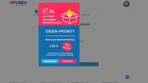 Dem Ganzen die Krone aufgesetzt hat bislang Aponeo: Hier können sich Kunden eine bevorzugte Bearbeitung ihrer Bestellung erkaufen. Was auch immer das konkret bedeutet, es wirft kein besonders schmeichelhaftes Licht auf den Berufsstand. Die Wettbewerbszentrale hat sogar schon angekündigt, sich das Angebot unter apothekenrechtlichen Aspekten einmal genauer ansehen zu wollen.