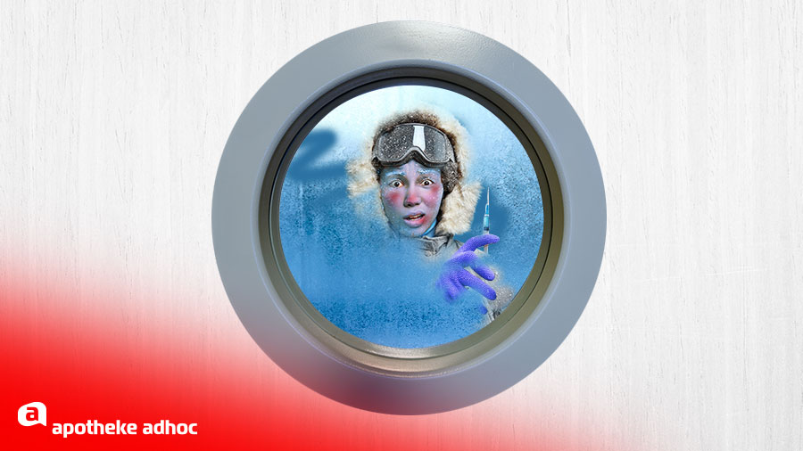 Was Charlotte in ihrem heiteren Berufseifer übersehen hatte: die Arbeitsbedingungen im Impfzentrum. Aufgrund der neuesten Stabilitätsdaten muss der Impfstoff nicht nur bei -80 °C gelagert und transportiert, sondern auch bei dieser Temperatur verarbeitet werden. In der Ultratiefkühlkammer wird der Vakzine ein weiterer Stoff zugesetzt und dann in der Hand langsam erwärmt.