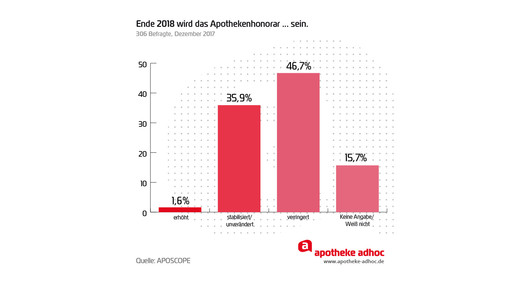 Was 2018 auf jeden Fall Thema bleiben wird, ist das Honorargutachten von Zweihaem. Ein Kollege hat mal unverbindlich und kostenlos eine Gegenrechnung aufgestellt. Er kommt zu dem erstaunlichen Ergebnis, dass man das Geld verdienen muss, das man in ein Geschäft investiert. Auch der MVDA hält dagegen. Die Kollegen sind trotzdem skeptisch: Viele befürchten, dass schon in diesem Jahr eine Honorarkürzung droht, wie eine Umfrage von APOSCOPE ergab.