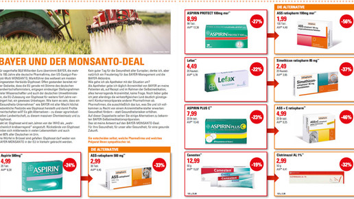 Aber auch die Hersteller haben es nicht leicht. Öko-Test hat mal wieder Hustenmittel aufs Korn genommen. Und Bayer muss sich wegen des Monsanto-Deals mit Glyphosat-kritischen Apothekern herumplagen. Die streichen Aspirin oder wiegeln die Patienten mit Flyern auf.