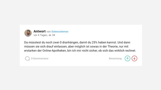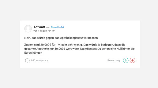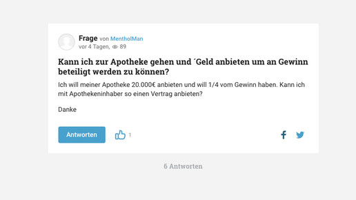 Interessanter ist da die Debatte über die Dosierung für die Kinderpräparate in verschiedenen Indikationen, an der sich auch Pharmazeuten beteiligen können. Wahrscheinlich beteiligen müssen, wenn sie von Müttern und Vätern darauf angesprochen werden. Das sind berechtigte Fragen. Eher wunderlich sind dagegen einige Fragen, die Apothekenkunden untereinander im Netz klären, oder zu klären versuchen. Zum Beispiel, ob man einem Apotheker für 20.000 Euro ein Viertel des Gewinns abkaufen kann. Müsste man mal 2hm rechnen lassen.