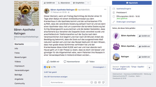 Aus der Seele gesprochen hat seinen Kollegen auch Wolfgang Wittig, Inhaber der Bären-Apotheke in Ratingen. Ihm und seiner PTA war aufgefallen, dass eine Rezeptur für ein Baby viel zu hoch dosiert war. Auf Facebook ließ er seinen Gedanken freien Lauf, warum diese Arbeit den Kassen nur 6,52 Euro wert ist und warum in der Presse allzu oft zu lesen ist, dass es „doch viel besser und günstiger für die Allgemeinheit wäre, wenn Patienten ihre Rezepte in einer Versandapotheke in Holland einlösen würden ...“ Innerhalb weniger Stunden wurde das Beitrag tausendfach geteilt und geliked.