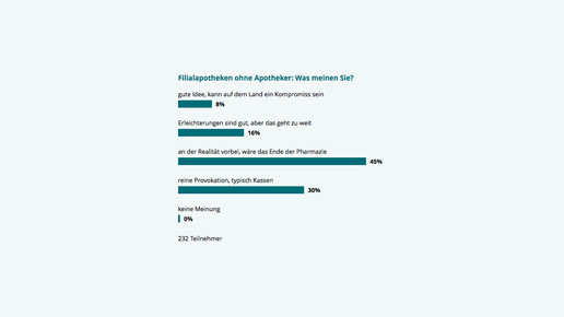Stackelbergs Vorschlag, Filialapotheken ohne Apotheker vor Ort zu betreiben, geht aus der Sicht der Mehrheit an der Realität vorbei. 45 Prozent der Befragten meinten, eine Umsetzung dieser Idee wäre das Ende der Pharmazie. Fast jeder Dritte (30 Prozent) fand den Vorschlag gar so realitätsfern, dass sie ihn nicht ernst nahmen: Es sei eine reine Provokation – eben typisch Kassen.