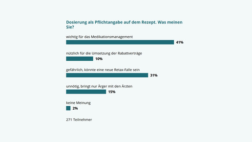 In der Umfrage erklärten 41 Prozent der Teilnehmer, die Dosierangabe auf dem Rezept sei wichtig für das Medikationsmanagement. Weitere 10 Prozent befürworten die verpflichtende Angabe – die Information sei nützlich für die Umsetzung der Rabattverträge. So hatte 2012 auch die Apothekerkammer Nordrhein argumentiert, die beim Deutschen Apothekertag (DAT) einen entsprechenden Antrag eingereicht hatte.
