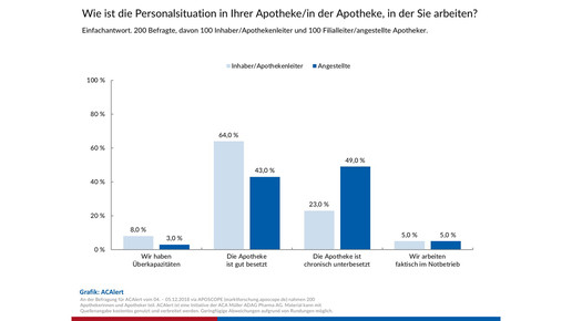 Personalsuche und Fachkräftemangel gehörten auch in diesem Jahr in vielen Apotheken zu den drängendsten Problemen. Allerdings schätzen Inhaber und Angestellte die aktuelle Personalsituation im Betrieb unterschiedlich ein, wie eine Umfrage von APOSCOPE aus der Reihe ACAlert im Auftrag von ACA Müller ADAG Pharma zeigt.