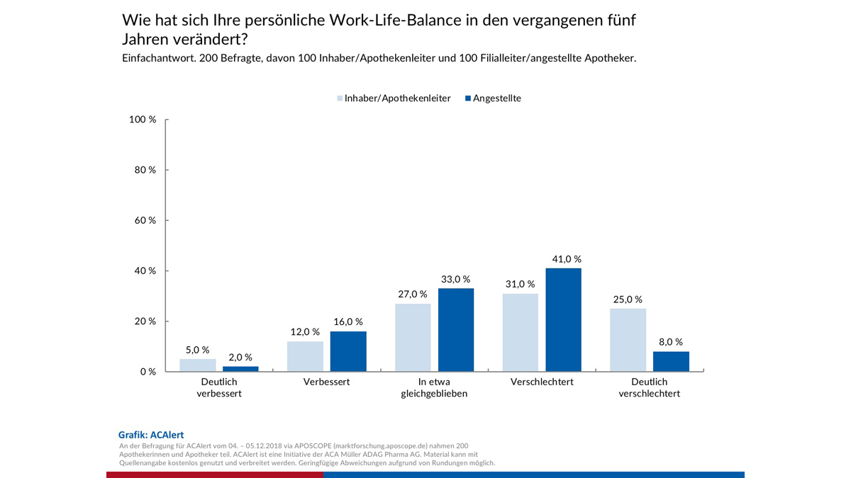 Die Chefs empfinden den Druck noch deutlicher als ihre Angestellten. Von den befragten Inhabern gaben 31 Prozent an, ihre Work-Life-Balance habe sich verschlechtert, bei weiteren 25 Prozent „deutlich verschlechtert“. Unter den angestellten Approbierten und Filialleitern ist das Verhältnis 41 zu 8 Prozent. Auf der anderen Seite sprechen 5 Prozent der Inhaber von einer deutlichen Verbesserung, aber nur 2 Prozent der Angestellten.
