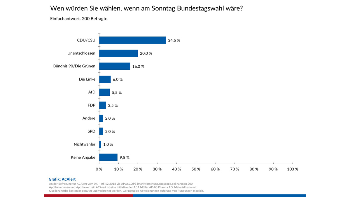 An der Umfrage von APOSCOPE aus der Reihe ACAlert nahmen am 4. und 5. Dezember 2018 insgesamt 200 Apotheker teil, darunter 100 Inhaber. Die Befragung wurde vom Importeur ACA Müller ADAG Pharma in Auftrag gegeben.