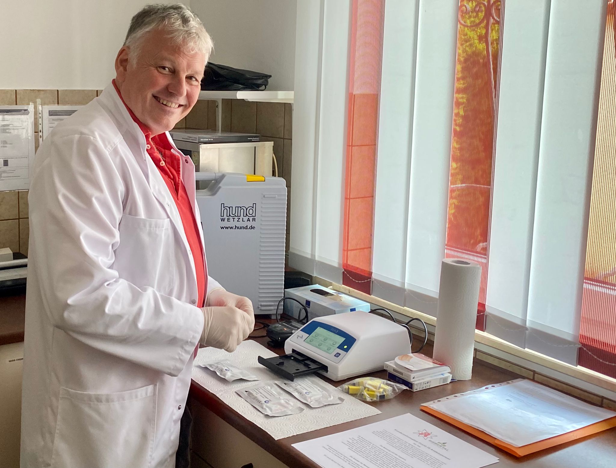 Das Covid-19-Antikörper-Testgerät bezog der Apotheker von Helmut Hund. Es stammt von der Protzek Gesellschaft für Biomedizinische Technik. Für den Nachweis wird das Blut der Kund:innen auf die Immunglobuline M und G (IgM bzw. IgG) gegen das Spike-Protein der Sars-CoV-2-Viren untersucht. Der Test ist Firmenangaben zufolge nach sieben bis zehn Tagen nach einer Infektion möglich. Das Messergebnis wird als Index in IU/ml angegeben und liegt nach 15 Minuten vor. „Unser Test kann durch die höhere Genauigkeit und Zuverlässlichkeit bei der epidemiologischen Bestimmung der Seroprävalenz in der Bevölkerung beitragen“, so Protzek.