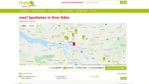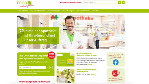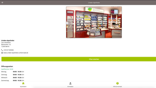 Der Versuch, über den Live-Chat von Meineapotheke.de (Mea) mit Apothekenmitarbeitern ins Gespräch zu kommen, ist beim ersten Versuch ziemlich enttäuschend. Auf der Startseite des Portals der Sanacorp-Kooperation wird die Funktion mit einem roten Button „Jetzt neu!“ beworben. Und wozu der Chat da ist, wird auch gleich verraten: „Fragen zur Gesundheit? Medikamente online bestellen?“ Im Suchfeld kann man Ortsnamen oder Postleitzahl angeben und wird dann zur Apothekensuche weitergeleitet, wo man nach dem neuen Online-Service ausfiltern kann. Die Suche nach Berlin ergibt drei Treffer: die Zwilling-Apotheke am Breitenbachplatz und die zwei Linden-Apotheken in Lichtenrade am südlichen Stadtrand.