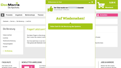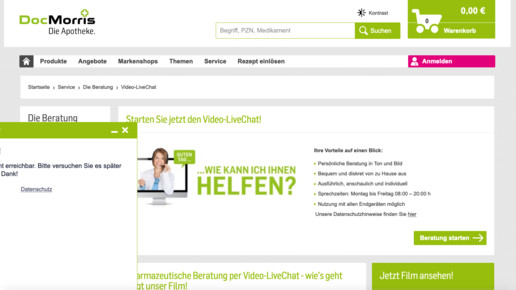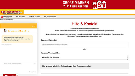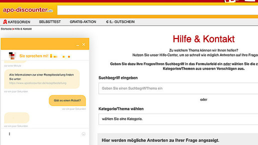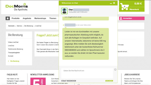 Und auch Versandapotheken haben wir getestet – hier gehört der Chat sicherlich zu den gängigeren Kommunikationsmitteln. Bei Apo-Discounter wird die Anfrage sofort aufgenommen; unsere Nachfrage bezüglich eines Rabatts auf Rezept wird ans pharmazeutische Team weitergeleitet – und korrekt beantwortet. Auch bei DocMorris funktioniert der Chat in Echtzeit; allerdings waren mehrere Anläufe nötig, weil der Chat gerade nicht erreichbar sei. In Heerlen bietet man übrigens seit 2014 auch Videochats an. Auch bei Aponeo war auf Anhieb ein Mitarbeiter per Chat zu erreichen. Dagegen steht bei Curavendi direkt über den Chat-Fenster: „Derzeit keine Chat-Funktion verfügbar.“