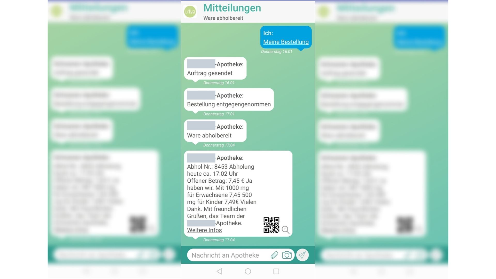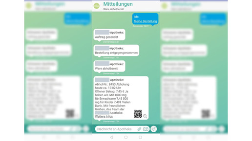 Bei „Deine Apotheke“ läuft auch die einfache Anfrage nach der Verfügbarkeit eines Präparates unter dem Status „Meine Bestellung“. In unserem Fall wurde bei einer zufällig ausgewählten Apotheke nach knapp 40 Minuten die „Bestellung entgegengenommen“ – dabei handelt es sich lediglich um die Anfrage nach Präparaten ohne expliziten Wunsch der Bestellung oder Reservierung, welche mit der Verfügbarkeit bestätigt wurden. Bei einer anderen getesteten Apotheke tauchte eine Stunde nach unserer Anfrage die Meldung „Ware abholbereit“ im Chatfenster auf. Unmittelbar danach folgte eine Textnachricht mit einer Abholnummer, dem offenen Betrag für die jeweiligen Stärke, sowie einem generierten QR-Code, welcher als digitaler Abholschein dienen soll. Wie bei jedem anderen Tool ist es also entscheidend, wie die Apotheken es nutzen und darüber kommunizieren.