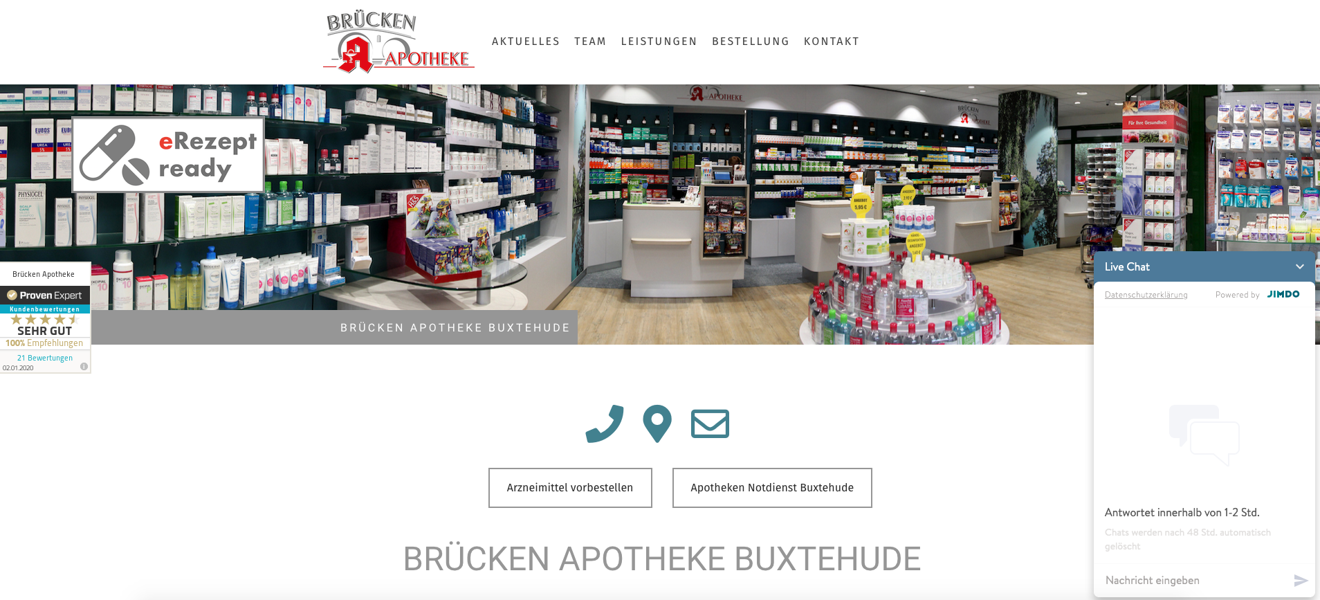 Inhaber Olaf Hansen geht direkt selbst ans Telefon und wir klären ihn über unseren Test auf. „Ach, dann waren Sie das, mit dem ich gerade gechattet habe“, antwortet er halb überrascht, halb amüsiert. Er freue sich, dass er unser Testsieger ist – dabei habe er mit dem Chat gar nicht so viel am Hut. „Ich mag eher telefonieren, Fax und E-Mail, jetzt wird ein neuer Kommunikationsweg aufgemacht, der mir ehrlich gesagt gar nicht so liegt“, sagt er. Er sei „schon 50+“ und damit gar nicht mehr so prädestiniert für all die neuen Kanäle. „Aber ich will das ja hier noch ein paar Jahre machen und die Apotheke irgendwann an meinen Sohn übergeben, da muss ich natürlich auf der Höhe der Zeit bleiben.“