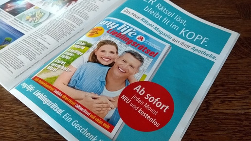 My Life hat zwei Doppelseiten Rätsel, verweist aber auf der vorletzten Seite auf das eigene Magazin „My Life Lieblingsrätsel“. „Ab sofort jeden Monat neu und kostenlos“, heißt es dazu, „Ein Geschenk Ihrer Apotheke.“