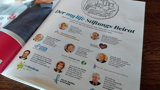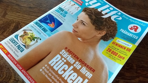 Ebenfalls neun Seiten umfasst das „Rücken-Dossier“ von My Life. Die Titelgeschichte beginnt im zweiten Drittel des Hefts auf Seite 34. Wie in der Umschau berichtet ein Betroffener, der groß auf einem Foto dargestellt wird. Bildlich werden weniger Experten dargestellt. Grafisch werden das Thema Bandscheibe vorgestellt und Tipps für Rückenübungen gegeben.