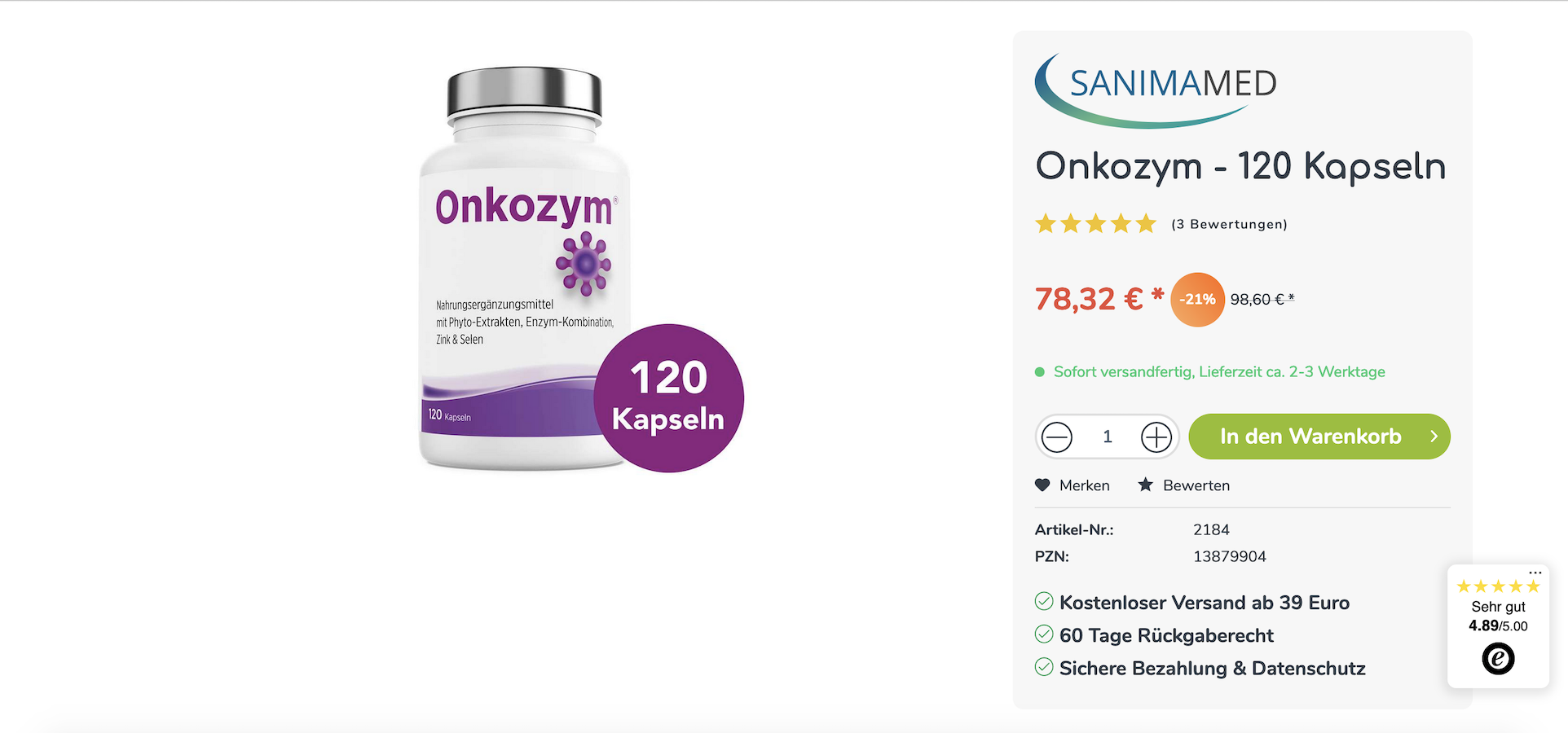 Der Verband Sozialer Wettbewerb (VSW) hat mehrere Apotheken wegen des Vertriebs beziehungsweise der Werbung für die Kapseln Onkozym abgemahnt. Kritisiert werden unter anderem fehlende anerkannte wissenschaftliche Daten in der Produktbeschreibung. Bei dem Präparat handelt es sich um eine Marke des Unternehmens Sanimamed Europe Health mit Sitz in Bukarest. Der Exklusivvertrieb der Ware erfolgt laut Firmenangaben über den Versandhändler Green Offizin, der ebenfalls in Rumänien sitzt – gegen beide kann der VSW aufgrund der ausländischen Adresse nicht vorgehen.