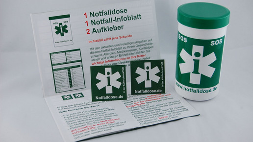 Die Notfalldose wird seit 2014 vertrieben. Sie soll zum leichten Auffinden im Kühlschrank als einheitlicher Ort gelagert werden und enthält ein Formular mit den Notfalldaten. Angeboten wird sie exklusiv über die Bremer Firma Volbert Hausnotruf. Die Apothekerkammer Westfalen-Lippe unterstützt die Initiative mit dem Essener Großhändler Noweda und ließ Ende 2018 an jede Apotheke sogar gratis 20 Behälter verteilen.