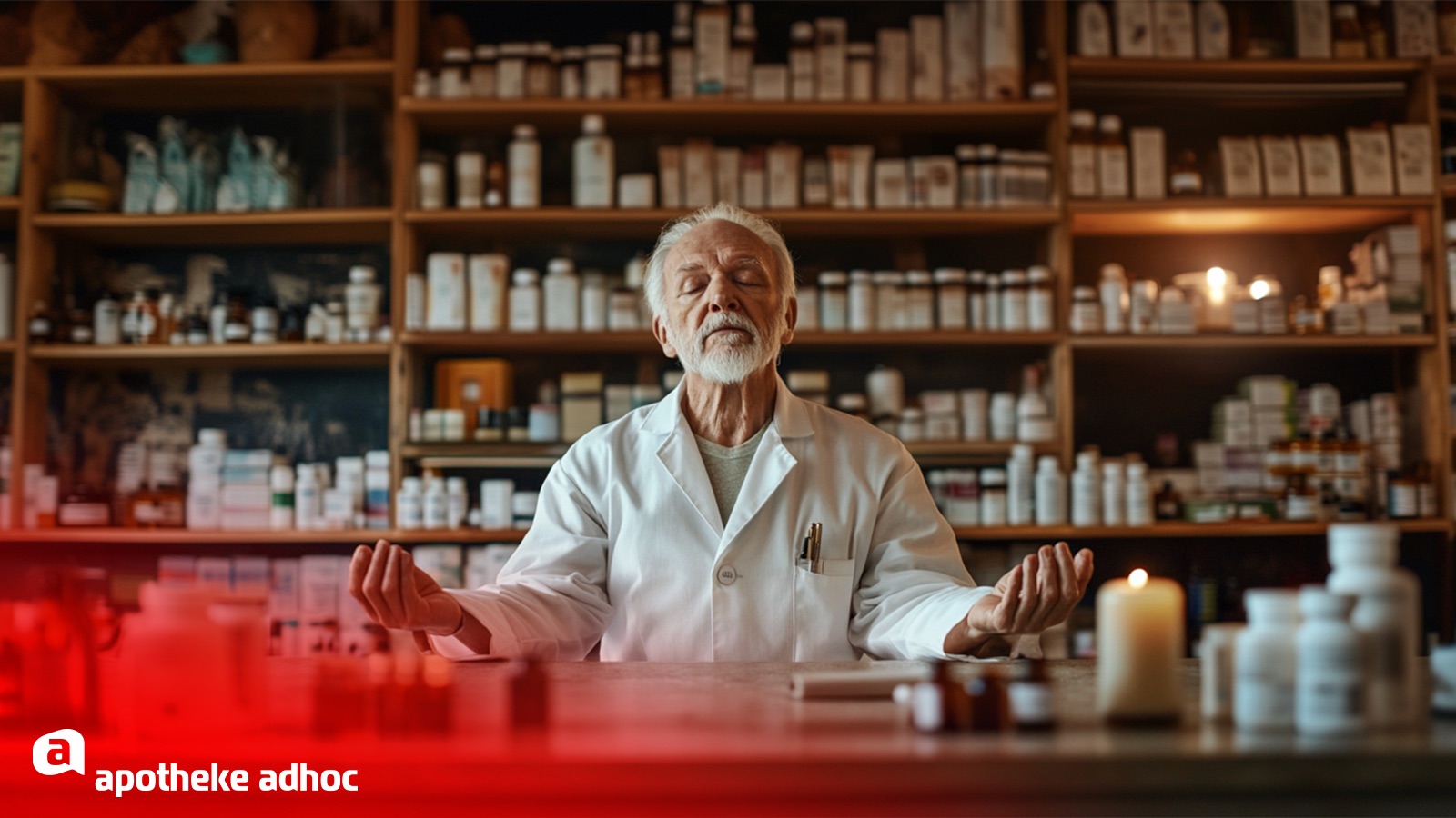 Früher begann er seinen Tag mit Kassenabschluss und Kontrollbögen. Heute beginnt er ihn mit einer geführten Tiefenmeditation. Er faltet die Hände – zum Loslassen. Erwartungen. Umsatzprognosen. Existenzängste. Der Apothekenalltag prallt an ihm ab wie Rabattverträge an einem Seelenpanzer. Und mit diesem Panzer stellt er sich den Fragen seiner Mitarbeitenden: „Ein kaputter Scanner? Dafür gibt es eine Hotline. Rückerstattung? Können wir uns nicht leisten. Hochpreiser? Können wir uns erst recht nicht leisten. Der Großhandel hat nicht geliefert? Das können die sich nicht leisten.“