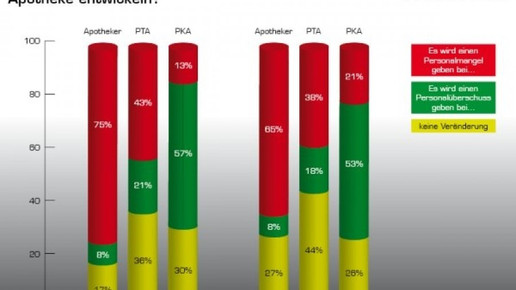 Deutschlands Apothekenleiter und -mitarbeiter rechnen damit, dass in den kommenden Jahren qualizierte Arbeitskräfte fehlen werden. Drei von vier Inhabern und zwei von drei Angestellten gehen davon aus, dass es zu einem Mangel an Approbierten kommen wird. Rund 40 Prozent rechnen damit, dass nicht mehr alle freien PTA-Stellen besetzt werden können. Nur bei PKA erwartet die Mehrheit der Branche keine Engpässe. Dies geht aus der APOTHEKE ADHOC Umfrage hervor, an der 135 Apothekenmitarbeiter und 123 Inhaber teilgenommen haben.