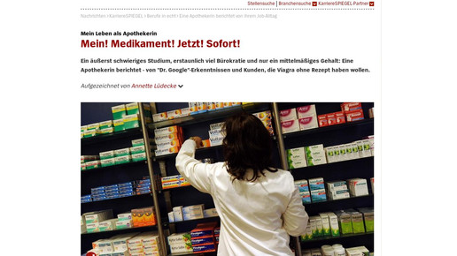 Apotheker werden für Spiegel Online normalerweise skeptisch beäugt, Fehltritte in der Branche skandalisiert und die Lobby verteufelt. Umso erstaunlicher, dass jetzt eine Apothekerin zu Wort kommt und ausführlich aus ihrem Alltag berichten darf. In „Mein Leben als Apothekerin“ erzählt sie vom Dr.-Google-Wahnsinn und dem Befragen eines Pendels. Und klagen darf sie auch.