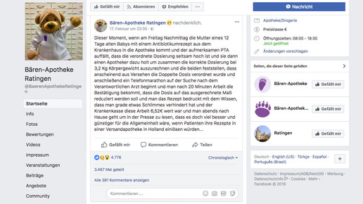 Kurz vor Mitternacht veröffentlichte Wittig den Beitrag am Freitagabend auf der Facebook-Seite seiner Apotheke. Schon nach wenigen Minuten verbreitete sich der Text in Windeseile, mittlerweile wurde er mehr als 4600 Mal geliked und knapp 3400 Mal geteilt.