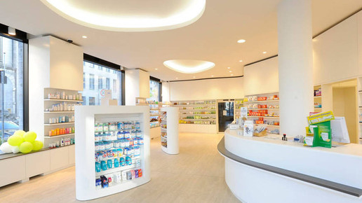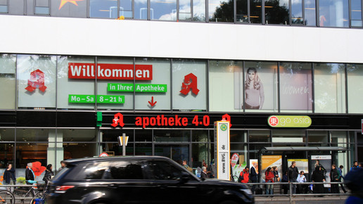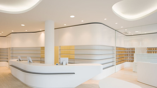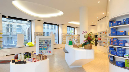 Der international renommierte Designer Werner Aisslinger hat in Berlin seine erste Apotheke entworfen. Glasbausteine und helle Eleganz dominieren die Offizin, die man an diesem Ort überhaupt nicht erwartet: Die Apotheke befindet sich in einer neu eröffneten Shopping-Mall in einem aufstrebenden Arbeiterbezirk.