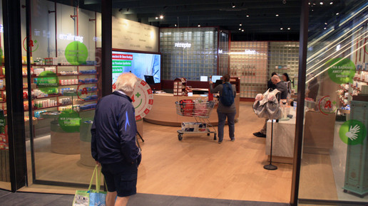 Die Premium Apotheke im Schultheiss Quartier ist wirklich premium. Wer sie betritt, wird von freundlichem Personal begrüßt, das Ambiente ist zwar noch Offizin, aber mit jenem Schuss Leichtigkeit, der sie zu einem besonderen Ort macht. Keine überfüllten, kunterbunten Regale beleidigen das Auge, alles wird locker und wohlgeordnet in schlichten, braunrot lackierten Stahlregalen präsentiert. Die digitale Sichtwahl erstreckt sich über eine große Seitenwand des fensterlosen Ladenlokals.