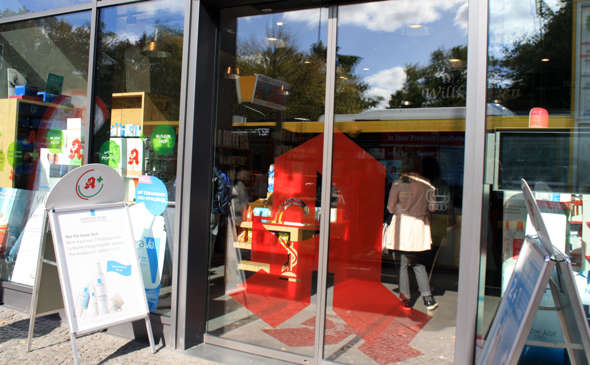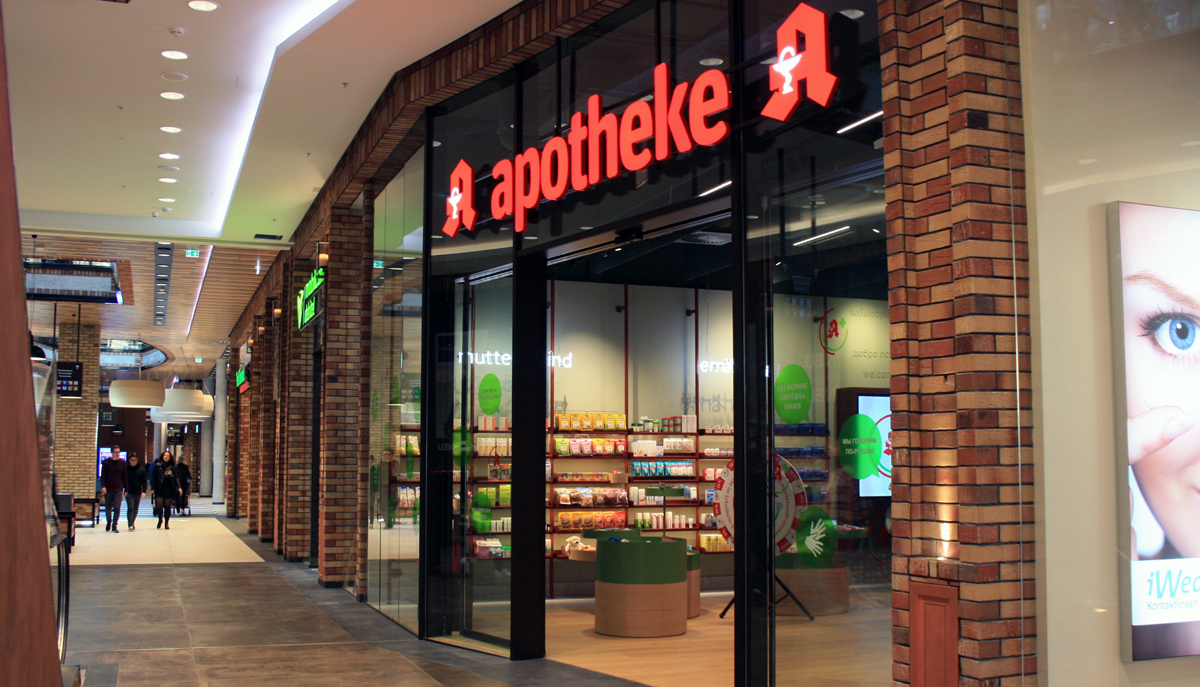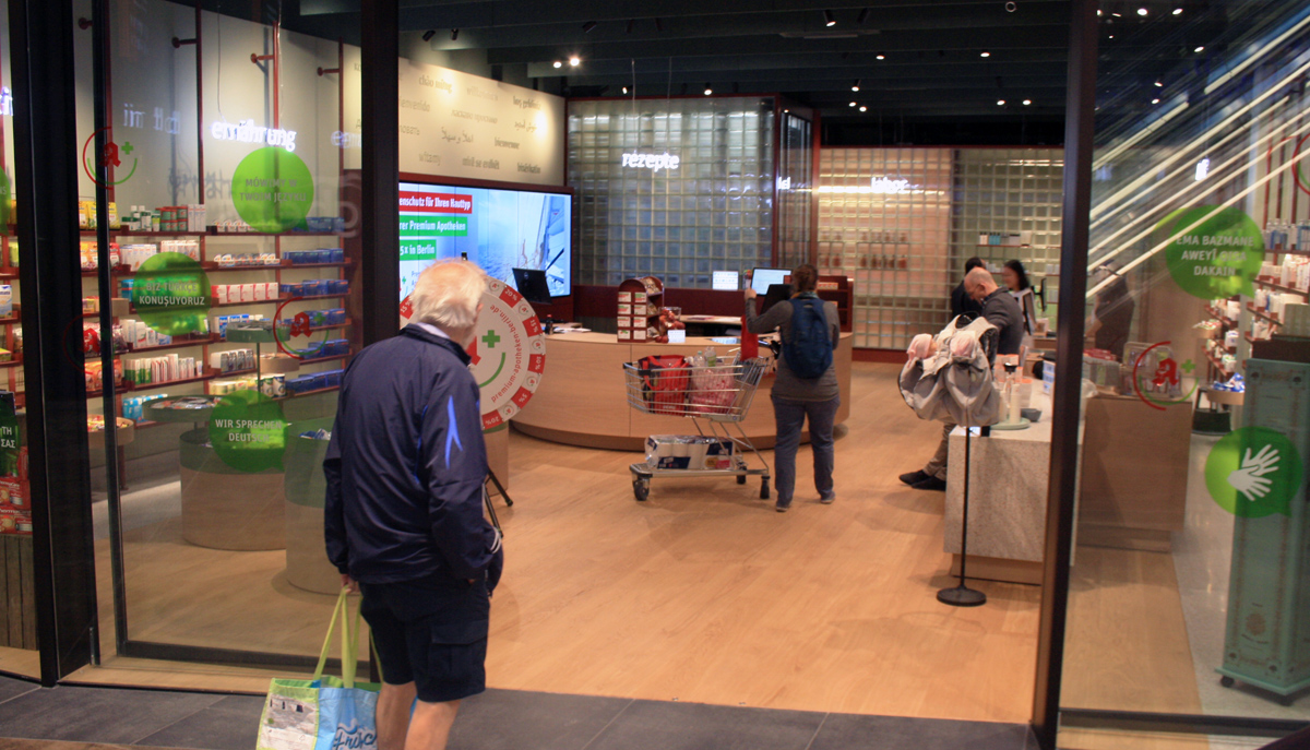 Der international renommierte Designer Werner Aisslinger hat in Berlin seine erste Apotheke entworfen. Glasbausteine und helle Eleganz dominieren die Offizin, die man an diesem Ort überhaupt nicht erwartet: Die Apotheke befindet sich in einer neu eröffneten Shopping-Mall in einem aufstrebenden Arbeiterbezirk.
