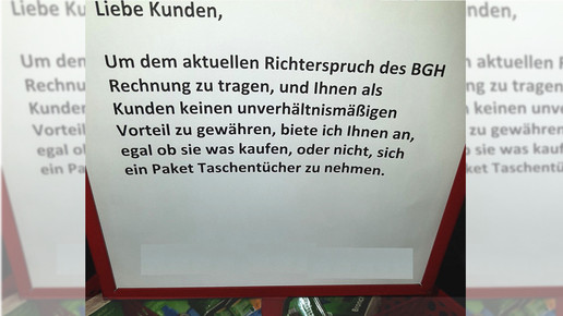 Thiel hat deshalb kurzerhand heute ein Schild für die Kunden in eine Schütte in der Freiwahl gestellt. Darauf steht: „Um dem aktuellen Richterspruch des BGH Rechnung zu tragen, und Ihnen als Kunden keinen unverhältnismäßigen Vorteil zu gewähren, biete ich Ihnen an, egal ob sie was kaufen, oder nicht, sich ein Paket Taschentücher zu nehmen.“ Jeder könne sich bedienen, wie er wolle, so Thiel, der seit neun Jahren selbstständig ist.