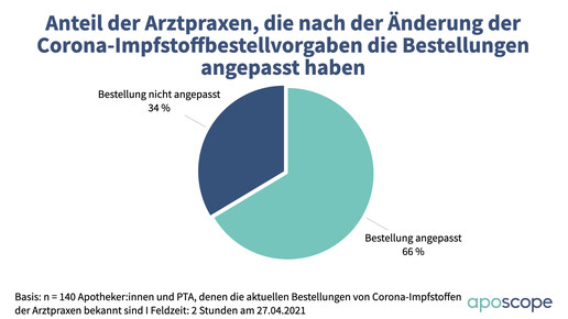 In zwei von drei Fällen (66 Prozent) haben die Arztpraxen nach der Änderung der Vorgaben ihre Bestellungen noch einmal angepasst – am Freitagabend hatte die Kassenärztliche Bundesvereinigung (KBV) mitgeteilt, dass Johnson & Johnson doch noch nicht dabei ist, dafür aber 400.000 Dosen mehr AstraZeneca bestellt werden können. Davon hat allerdings nur jede vierte Praxis Gebrauch gemacht (24 Prozent), weitaus häufiger haben die Ärzt:innen zusätzliche Dosen Biontech geordert (84 Prozent).