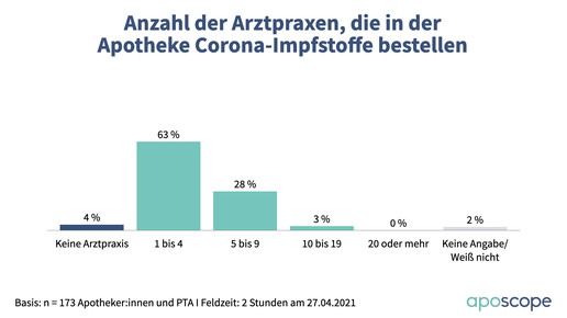 Knapp zwei von drei Apotheken beliefern laut Umfrage zwischen eine und vier Praxen mit Corona-Impfstoff (63 Prozent), weitere 28 Prozent bis zu 9 Praxen und 3 Prozent bis zu 19 Praxen. Auf der anderen Seite gaben nur 4 Prozent der Befragten an, dass ihre Apotheke keine einzige Praxis mit Impfstoff versorgt.