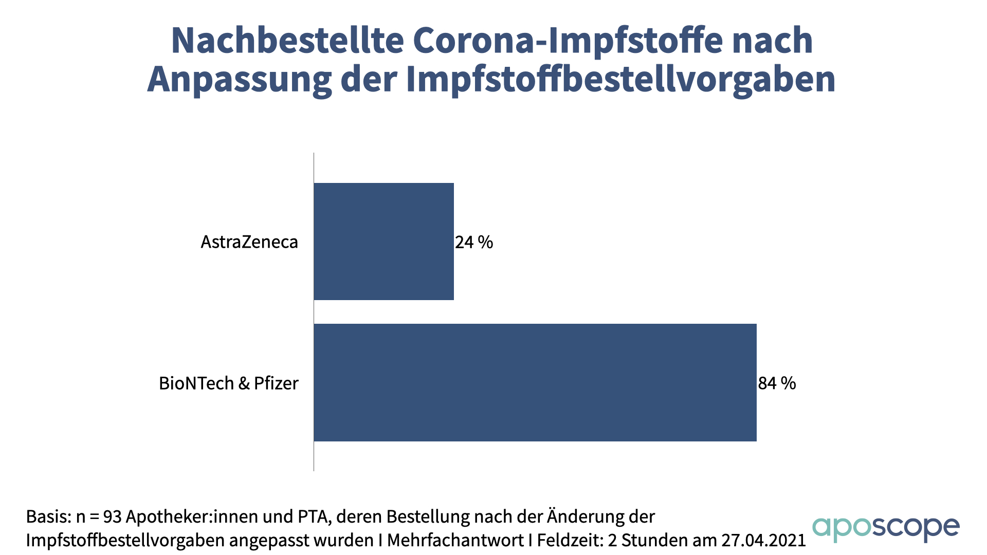 In zwei von drei Fällen (66 Prozent) haben die Arztpraxen nach der Änderung der Vorgaben ihre Bestellungen noch einmal angepasst – am Freitagabend hatte die Kassenärztliche Bundesvereinigung (KBV) mitgeteilt, dass Johnson & Johnson doch noch nicht dabei ist, dafür aber 400.000 Dosen mehr AstraZeneca bestellt werden können. Davon hat allerdings nur jede vierte Praxis Gebrauch gemacht (24 Prozent), weitaus häufiger haben die Ärzt:innen zusätzliche Dosen Biontech geordert (84 Prozent).