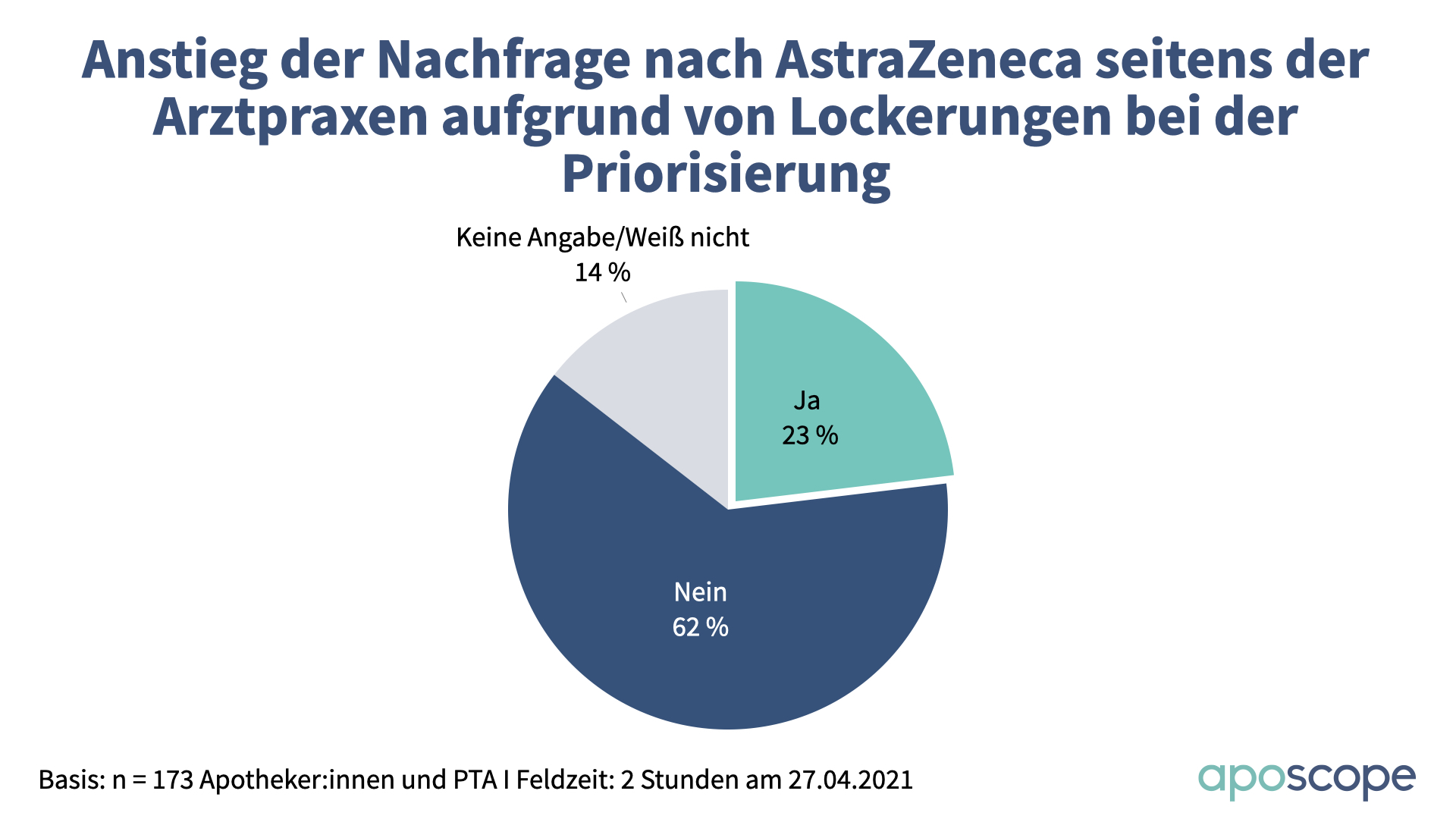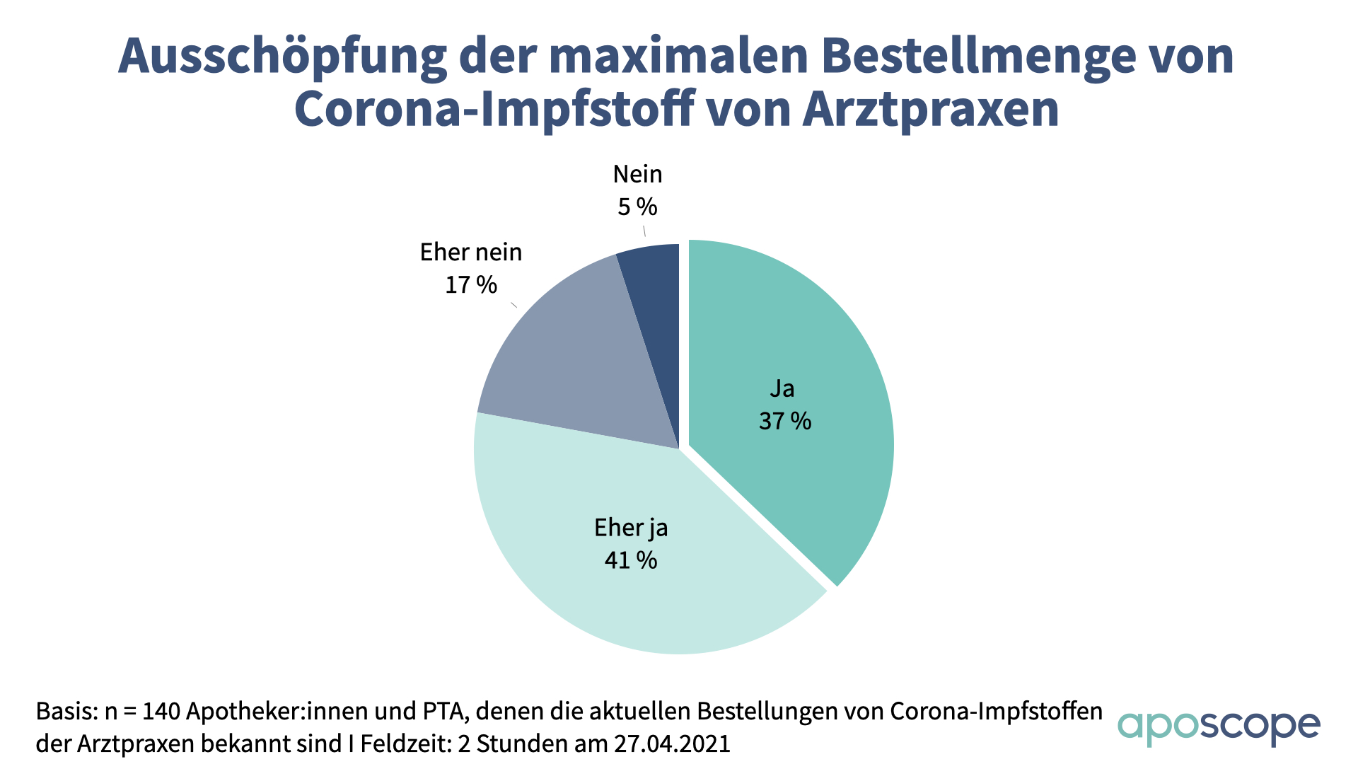 Generell wird die maximale Bestellmenge weitgehend ausgenutzt, so 78 Prozent der Teilnehmer:innen. Bei AstraZeneca sehen 90 Prozent noch Luft nach oben, bei Biontech sind es nur halb so viele. Dass die Nachfrage nach AstraZeneca seitens der Arztpraxen wegen der Lockerung bei der Priorisierung steigt, findet nur jeder vierte Teilnehmende (23 Prozent).