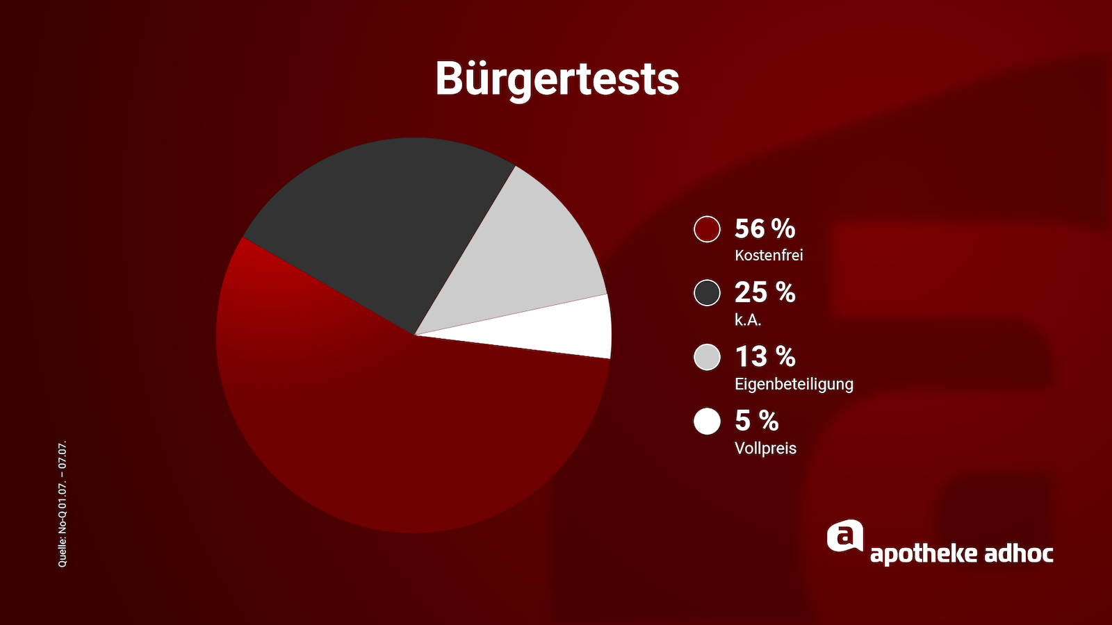 Damit entfallen 56 Prozent auf den Bereich der kostenlosen Bürgertests, 13 Prozent auf Tests mit Eigenbeteiligung und 5 Prozent Selbstzahler. Bei 25 Prozent machten die Testzentren keine Angaben zum Anlass beziehungsweise zur Abrechnung. Unter testbuchen.de können Verbraucher:innen die nächste Teststelle suchen.