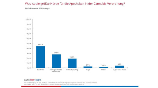 Unterdessen erschweren Lieferengpässe eine schnelle Versorgung. 28 Prozent bezeichneten dies als große Hürde in der Cannabis-Versorgung. Die Gründe liegen vor allem darin, dass Deutschland das „Gras“ importieren muss, zum Beispiel aus den Niederlanden oder Kanada. Im Jahr 2019 sollte die erste Ernte von deutschem Cannabis auf den Markt kommen, doch das Vergabeverfahren wurde gestoppt. Eine noch größere Hürde stellt für die Apotheken nur noch die Bürokratie dar, sagt fast die Hälfte der Befragten. Jeder Fünfte kritisiert die Identitätsprüfung in der Apotheke, die vor Abgabe des Arzneimittels zu machen ist. Für einige Umfrageteilnehmer ist die Cannabis-Versorgung in der Apotheke mit einem erhöhten Arbeitsaufwand verbunden.