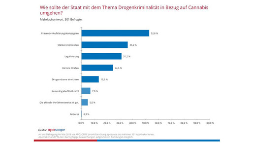 Die Fälle von Rauschgiftkriminalität sind im Jahr 2017 um rund 9 Prozent gegenüber dem Vorjahr gesunken. In den meisten Fällen waren Cannabis oder Kokain im Spiel. Im Zuge dessen forderte im Februar auch der Bund Deutscher Kriminalbeamter die „komplette Entkriminalisierung der Cannabis-Konsumenten“, da das Verbot willkürlich und rein historisch bedingt sei. Die Apothekenmitarbeiter sind sich uneinig in der Legalisierungsdebatte, mehr als die Hälfte wünschen sich jedoch mehr Präventions- und Aufklärungskampagnen. Rund 36 Prozent der Befragten sprechen sich für stärkere Kontrollen aus und jeder Vierte befürwortet härtere Strafen. 5 Prozent finden die aktuelle Situation angemessen.
