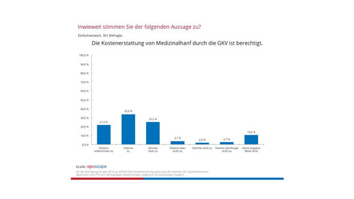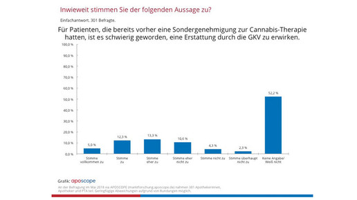 Cannabis wird derzeit in Deutschland bei „schwerwiegenden“ Erkrankungen eingesetzt, eine konkrete Indikation nennt der Gesetzgeber nicht. Daraus ergeben sich teilweise Probleme bei der Kostenübernahme, da der Interpretationsspielraum des Begriffs sehr groß ist. Nach Sozialgesetzbuch (SGB V) müssen die Krankenkassen bei vorliegendem Rezept und sorgfältig ausgefüllten Antrag für die Kosten der Therapie aufkommen. 81 Prozent der Befragten gab an, dass sie eine Kostenerstattung durch die Kassen als berechtigt ansehen. Nur rund 5 Prozent der Apothekenmitarbeiter befürworten das nicht.