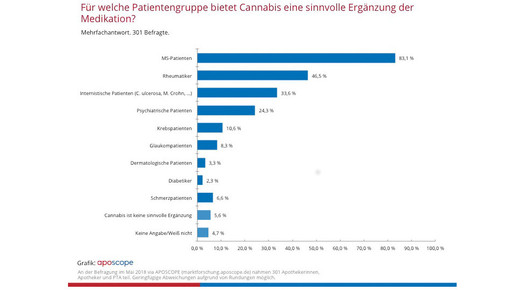 Vor allem für Patienten mit Multipler Sklerose oder Rheuma sehen die Fachkräfte aus der Apotheke einen Nutzen von Cannabis. Aber auch bei chronisch-entzündlichen Krankheiten wie Colitis ulcerosa oder Morbus Crohn oder auch bei psychiatrischen Erkrankungen könnte Cannabis einen positiven Effekt haben. Nur etwa 6 Prozent der Befragten gab an, dass die Blüten überhaupt keine sinnvolle Ergänzung in einer Therapie seien.