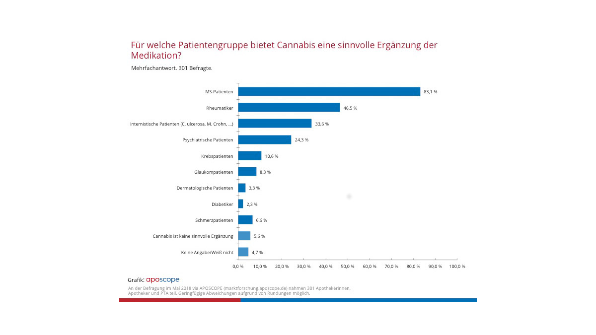 Vor allem für Patienten mit Multipler Sklerose oder Rheuma sehen die Fachkräfte aus der Apotheke einen Nutzen von Cannabis. Aber auch bei chronisch-entzündlichen Krankheiten wie Colitis ulcerosa oder Morbus Crohn oder auch bei psychiatrischen Erkrankungen könnte Cannabis einen positiven Effekt haben. Nur etwa 6 Prozent der Befragten gab an, dass die Blüten überhaupt keine sinnvolle Ergänzung in einer Therapie seien.