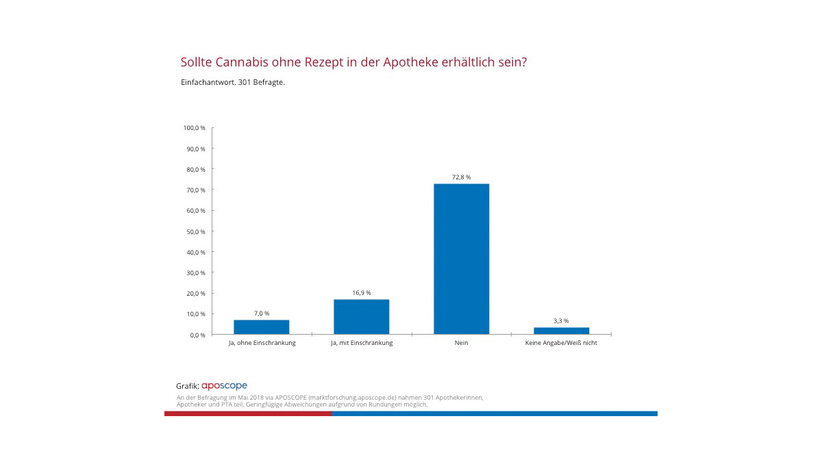 Die Fälle von Rauschgiftkriminalität sind im Jahr 2017 um rund 9 Prozent gegenüber dem Vorjahr gesunken. In den meisten Fällen waren Cannabis oder Kokain im Spiel. Im Zuge dessen forderte im Februar auch der Bund Deutscher Kriminalbeamter die „komplette Entkriminalisierung der Cannabis-Konsumenten“, da das Verbot willkürlich und rein historisch bedingt sei. Die Apothekenmitarbeiter sind sich uneinig in der Legalisierungsdebatte, mehr als die Hälfte wünschen sich jedoch mehr Präventions- und Aufklärungskampagnen. Rund 36 Prozent der Befragten sprechen sich für stärkere Kontrollen aus und jeder Vierte befürwortet härtere Strafen. 5 Prozent finden die aktuelle Situation angemessen.