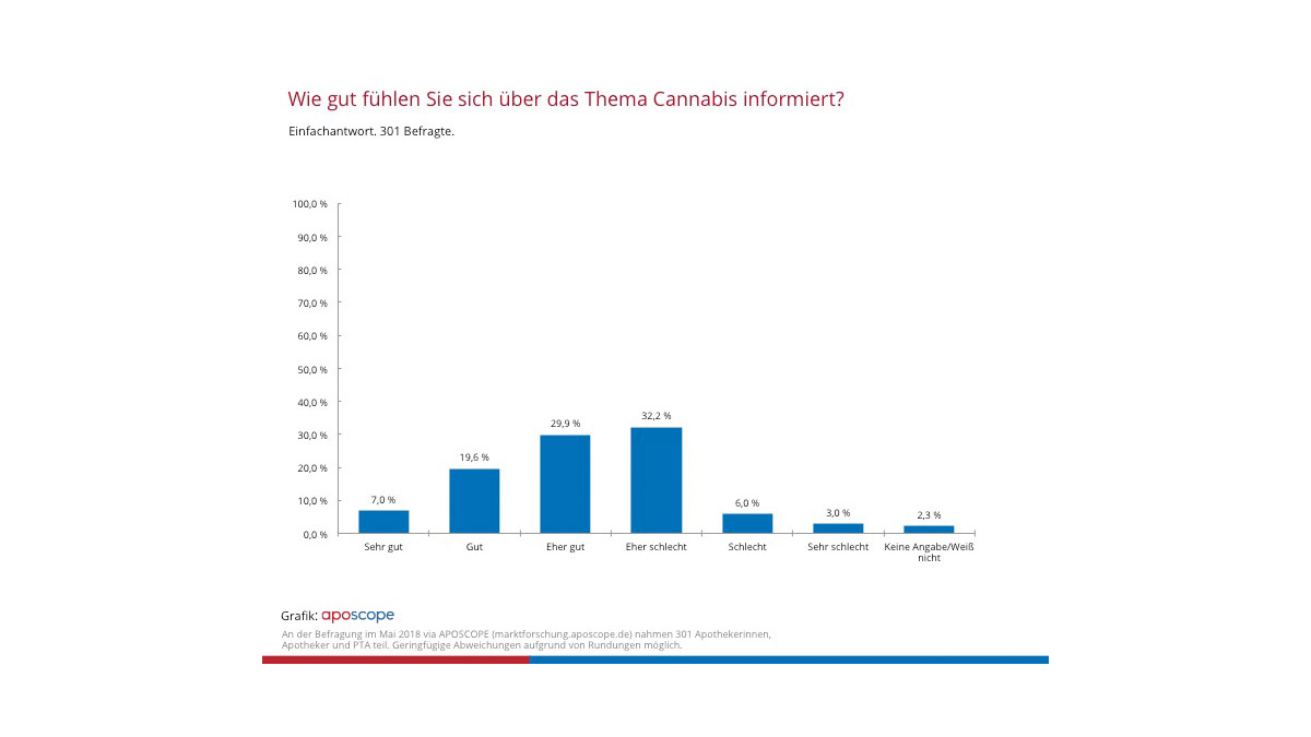 Informationen zu Cannabis halten die Apothekerkammern bereit und bieten Fortbildungen zu diesem Thema an. Des Weiteren ist eine Fortbildung über die Fachpresse oder Literatur möglich. Rund 57 Prozent der Befragten gaben an, dass sie sich gut bis sehr gut beim Thema Cannabis auskennen – hier liegen Apotheker deutlich vor PTA. Ein beachtlicher Teil fühlt sich hingegen schlecht informiert. Die Mehrheit begrüßt, dass Patienten nun keine Sondergenehmigung mehr brauchen und die Apotheken keine Erlaubnis vom Bundesinstitut für Arzneimittel und Medizinprodukte (BfArM) einholen müssen. Dadurch werde die Arbeit erleichtert.